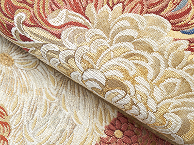 こちらは色々な形をした菊のお花がたっぷりとした織りで表された洛風林さんの袋帯です。