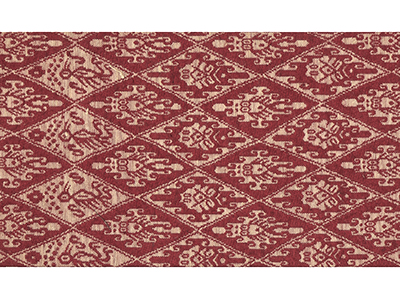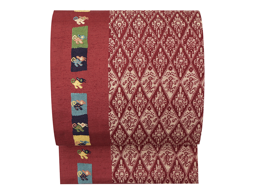 こちらの帯はお太鼓にした時に、左の3分の1は明るい葡萄茶・蘇芳色がベースとなり、右側の3分の2は南米の織物そのもののような深い葡萄色を使って織られていて、少しユニークと言えるかもしれません。
