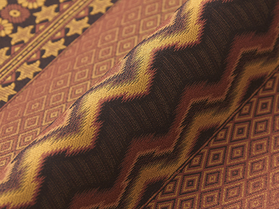 その洗練された個性的なデザインと色使いでファンの多い曽根さんの作品ですが、今回は濃い(こげ茶色)と(茜色)で段替わりに名物裂の模様が織り出された格調高い袋帯です。