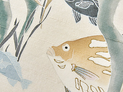【商品説明】 「春のよそほひ展」に向けて、店頭には春を告げるような楽しい柄の帯が色々と登場しています。 こちらは少し節があり、上質なシルクの光沢が感じられる白い紬地に、海藻の間を泳ぐ大小のお魚たちが図案とは対照的に友禅で丁寧に染められた名古屋帯です。 ユーモラスに描かれたお魚の名前は判明しませんが、なんとなく立派なひれのある2匹が主役のようです。 脇をかためる小さいお魚はメバルでしょうか。 お魚の図案はアンティークのものでもよく取り入れられていて、昔からどこかおめでたさもあり愛されるもののひとつのようです。 色使いがやわらかく楽しい雰囲気がありますので、色々な紬のお着物とお合わせいただけるのではないかと思います。 生成りの地色の帯は活用が効き、微笑ましい図案はお友達とのお出かけにお召しいただきますとお話も盛り上がりそうです。 魚の色は退紅色(あらぞめいろ)「#CB8584 color-sample.com」、辛子色「#EDC665 color-sample.com」、褐色(かちいろ)「#444B5B color-sample.com」を、 海藻の色は藍鼠色「#557177 color-sample.com」、黄海松茶色(きみるちゃいろ)「#867835 color-sample.com」をご参照下さい。