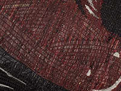 緯糸には黒と茜色の箔の生地を裂き織のように細く裂いたものが使用されていて、それがすくい織の技法で織られています。