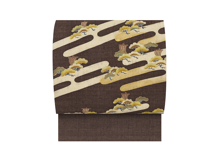 舟が描かれている事で風景画の要素が強くなり、松の図柄ですがお正月前後以外の季節にもお召しいただけるのが嬉しいですね。
