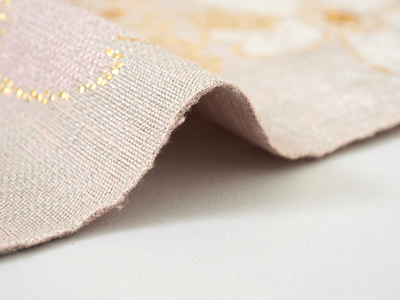 大ぶりな桜の花が、石竹色のピンクや、青味のある白・月白色、古典の綺麗さのある古代紫色、そして金銀の各色の箔糸で見事に織り分けられ、決して強いコントラストではありませんがそれぞれに美しく花開いています。