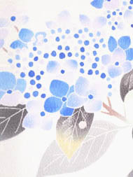 白汚しの淡いグレー味のある白地に、朝もやの様な霞のかかった調子で静かに咲く山紫陽花の花が瑞々しく見事な友禅で描かれた羽田登喜男氏の作品です。