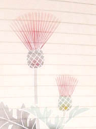 桜色よりもう少し明るいやさしいピンク色の絽塩瀬の地に、ゆったりとした時間が流れている様な瑞々しい薊の花が、素晴らしく細密な友禅で描かれた、人間国宝・羽田登喜男氏作の名古屋帯の作品です。