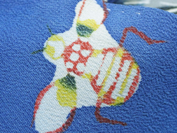 時代的に少し枯れてとても良いお色になった浅葱色に、型絵染ならではの可愛いどくだみの花と蜂やカミキリムシ、蝶々といった昆虫たちが楽しく描かれた一方附の小紋のお着物です。
