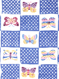 市松の中に並んだ小さな十字絣や蝶々の色の暈しなど、ひとつずつどこを見ていても飽きない不思議な魅力があります。