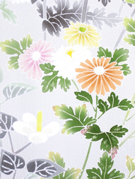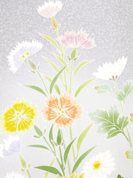 薊、菊、ドクダミ、河原なでしこなどの花が咲き競い、ひとつひとつは皆可憐な草花なのですが、躍動感のある構図とボリューム感で非常に華やかなお着物となっています。