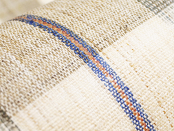 やや黄色味の感じられる苧麻の地に、黄海松茶色の太い格子が織られ、それに沿って濃いグレーの絣が織り込まれています。