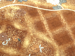 おそらく結城紬と思われる軽くしなやかな生地に、格子、七宝、経涌など何種類かの縫い絞りで柄をつけ、弁柄色の濃淡に染めて、その絞りの柄にあわせて摺金箔で表情がつけられています。