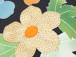 暈しで染められた花びらの繊細さは手に触れてみたくなりますし、細やかな手刺繍によって縁取られたお花のボリューム感など、次々と目を引く素晴らしさです。