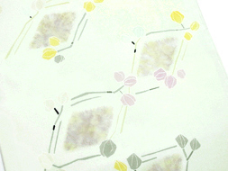 こちらは木原明さんの作品にしては少しシックな色使いとなっていますが、タイトルの通りに可愛い風船葛の実がモチーフとなった素敵な訪問着のお着物です。