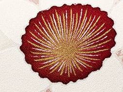 梅の枝が利休鼠色、菊の枝が深い小豆色で染められている事も、森口氏作品ならではの個性と言えるかもしれません。