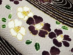 さらに桜、梅、菊、椿、紅葉など四季の草花が遠近感のあるタッチで華やかに散らされていて、梅の花の錆鼠色が素敵なアクセントとなっています。
