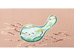 伽羅色の地に形の良い瓢の形がくり抜かれ、そこに綺麗な甕覗きの藍色が映えて別世界を垣間見るように風情のある風景が描かれています。