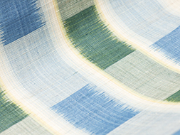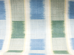 こちらの名古屋帯は水色と草色の少し太い縞が縦に走り、お太鼓の部分で同色の糸と交差して四角い絣になっています。