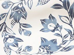 しっかりとした駒絽の生成りの生地に、藍の濃淡で芙蓉、桔梗、露草、鶏頭などの6、7種類のお花が丸紋の形にアレンジされ、楽しく連続してリズミカルな雰囲気で染めたられた、故・小島悳次郎さんの作品です。