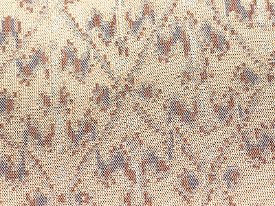 全体には中型の菱繋ぎの模様とその中に太子間道のような経絣の模様が織り込まれた、格調の高い名物裂文様となっています。