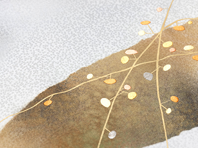 小さな紙吹雪のような地紋のある綸子地に、独特の透き通るような美しい地染めがされ、上前には枯茶色から鶯茶色の複雑に入れ混ざった摺り箔が施されています。