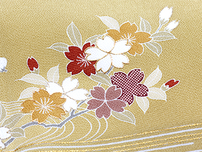 梅に菊、もみじ、橘、蒲公英、牡丹と四季の草花が色とりどりに描かれ、刺繍も施されていて古典の華やかさがありますが、糸目の霞の線には金彩も混ぜられ、さらに華やかさを添えているようです。
