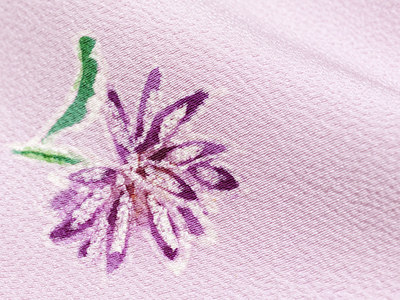 青味のある明るいピンク・石竹色のとても鮮やかで冴え冴えとした地色に、濃紅色の大輪の牡丹の花と葉の萌葱色のコントラストが美しく、そのまわりに散らされた小さな梅や桜の花の可憐さ、枝垂れるように花をつけた藤の滅紫色の優美さなど、見どころがたくさんあり、お着物ならではの華やかさにあふれています。