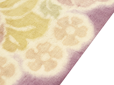 大きく描かれた唐花の模様には夾纈染めならではの十字の折れ線があり、おそらく大きく4つに畳んで板締めをして染料を挿していったのではないかと思われます。