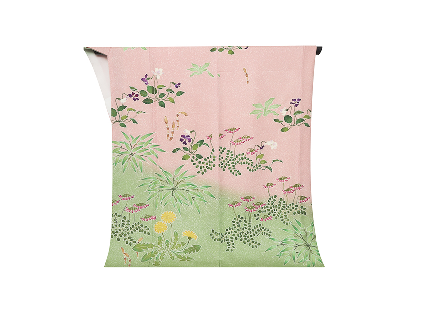 明るく澄んだピンク・紅梅色の地に、裾から綺麗な翡翠色の暈しが加えられ、レンゲ、タンポポ、土筆、スミレなど春の草花が色とりどりに描かれています。