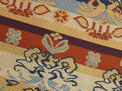 こちらの紹巴の作品も伝統的な文様の醸し出す独特の格調の高さを持ちながら、段によって変わる色の妙味や、向かい合う鳥の姿にも帯としての華やかさを充分に併せ持った美しさが感じられます。