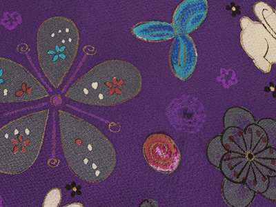 こちらは明るい紫・葡萄色の地に大きく小さくお花が散らされ、くるくる渦巻の丸と白いウサギが描かれた楽しい縮緬地の名古屋帯です。