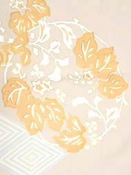 ピンク味を帯びたやわらかいベージュ地に、水浅葱色と玉子色の菱の模様が目に爽やかで、そこに大きめの丸紋の形にデザインされた桐が描かれた友禅の訪問着です。