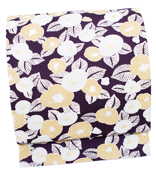 今を盛りに咲く寒椿の花が一面に描かれた型絵染の名古屋帯です。