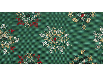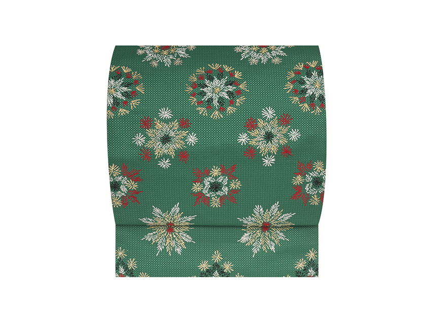 綺麗な緑・萌葱色地の細かな市松模様の地紋の織りとなっていて、そこに雪の結晶のような形のもみの木の葉が藍白色と金糸、そして百入茶色で、中心は深緋色の赤で織り出された可愛らしさのあるものです。