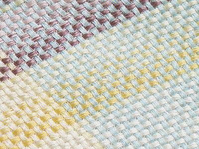 こちらは組みひものような斜め織の格子の模様が、片面は空色と半色の淡い薄紫、そして砥粉色の3色で織られ、もう片面は鉛丹色の淡いオレンジ色と淡萌黄、そして紺鼠色のグレーの3色で織られた大変お洒落で高級感のある半巾の帯です。