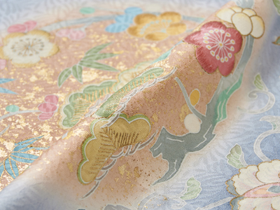 水柿色の梅、浅縹色の竹の葉、黄海松茶色の松とパステルカラーで染められ、明るく華やかです。