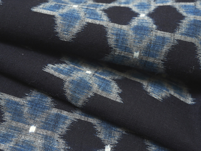 青戸さんはそんな綺麗な夜空を見てデザインを考えられたそうですが、大きな光に見立てられたお花の様な形をした星の浅葱色の絣が楽しく手を繋いで星座の形を作っているのが可愛く、それがお着物全体に散りばめられてまるで満天の星空のようで素敵です。